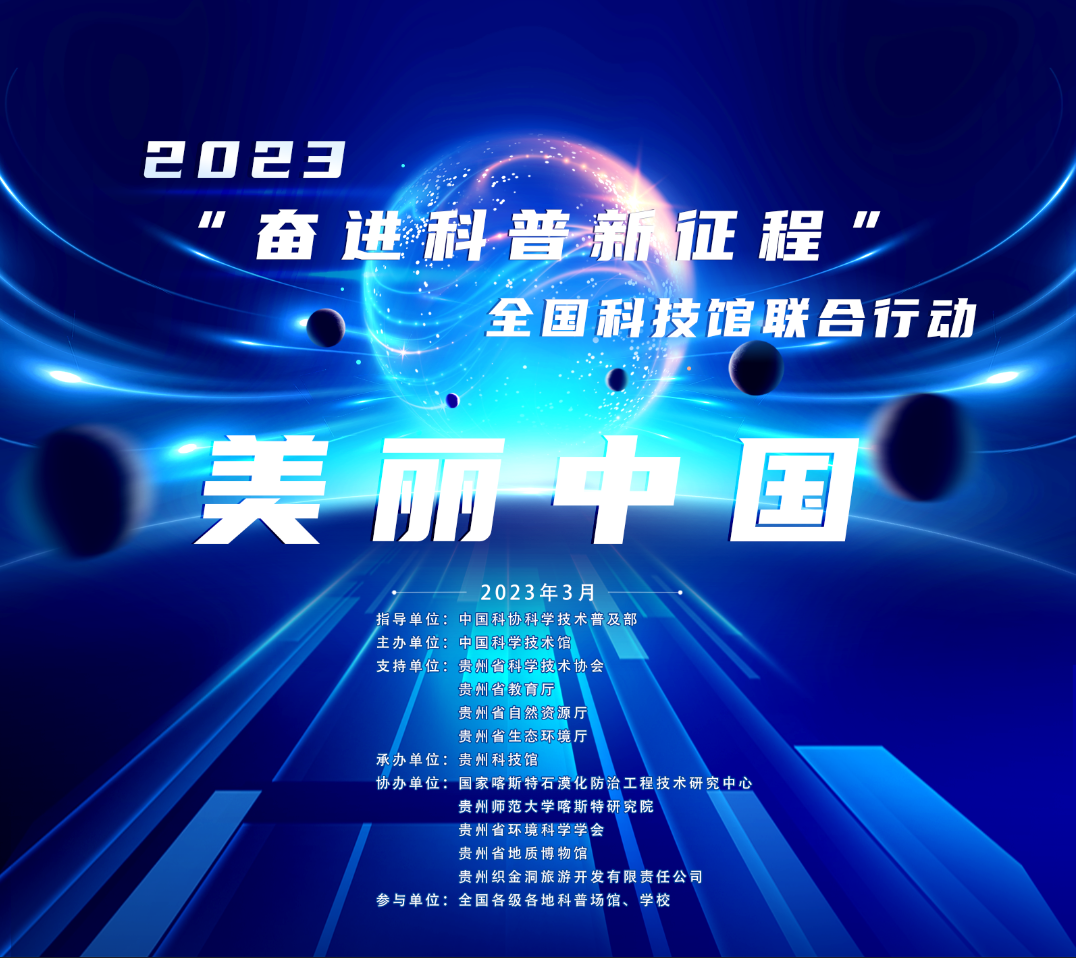 2023年“奋进科普新征程”全国科技馆联合行动由中国科技馆和中国自然科学博物馆学会科技馆专委会主办,设“美丽中国”“筑梦航开”“礼赞科学家”“新时代科学少年”等8个分主题,4期行业交流研讨活动及全年活动交流总结,分别由13家科技场馆联合承办。首站落户贵州,由贵州科技馆承办了3月“美丽中国”主题联动科普活动。