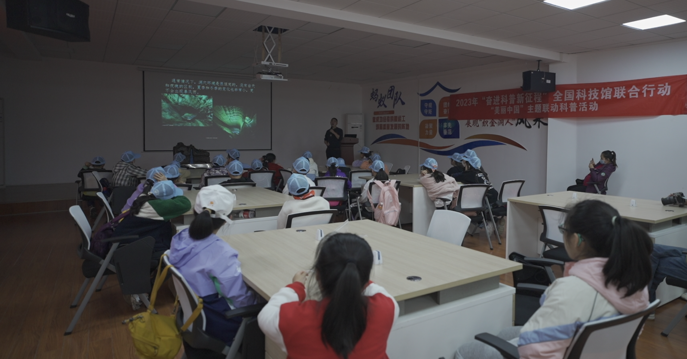 喀斯特洞穴课堂设在被誉为“中国十大奇洞”之首、“中国溶洞之王”的织金洞。同学们在贵州师范大学喀斯特洞穴研究中心主任杨卫诚和贵州科技馆老师们的带领下开展了生动有趣的探洞研学、科普讲座、互动实验等。