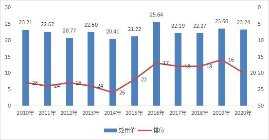 《报告》显示:2020年贵州省区域创新能力综合效用值为23.24,全国排名第20位,较2019年下滑4个位次。整体来看,从2010年起,贵州省全国排名呈波动上升趋势,表明我省的综合创新能力持续提升。其中,2014年排名最低为26位,2019年排名最高为16位(见图1)。