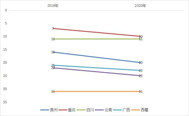 从西南六省(市)来看,与去年相比,贵州、重庆、云南和广西四省的全国排名均有所下滑,仅有四川排名未变,而西藏一直处于末位。其中,贵州下降了4个位次,幅度最大,重庆和云南分别下降了3个位次,广西下降了2个位次(见图2)。总体来说,贵州在西南六省的排名仍为第三位,但有被广西和云南赶超的趋势。