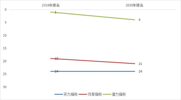 贵州的实力指标全国排名保持不变,仍为第24位,居全国下游水平。效率指标由2019年的全国第19位下降到2020年的第21位,下滑了2个位次,也跌入全国下游水平。潜力指标下降幅度最大,由2019年的全国第1位下滑至2020年度第4位,下降了3个位次,尽管这样,潜力指标仍是表现最好的指标(见图3)。