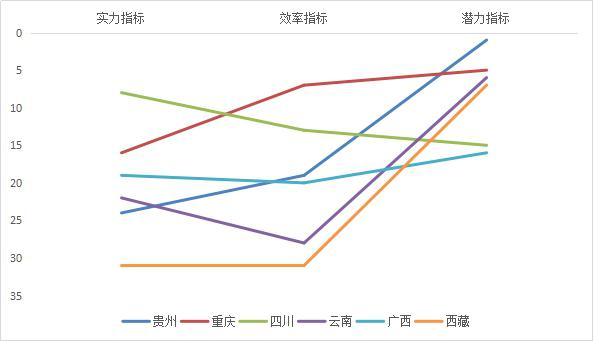 从西南六省(市)来看,2020年贵州实力指标排名仅高于西藏,位居倒数第二位,表明贵州各项指标的绝对量表现较差;效率指标位居西南六省第四位,较去年下降1位,处于中下水平;潜力指标尽管全国排名有所下滑,但是仍然表现优异,位居西南六省(市)首位(见图4)。