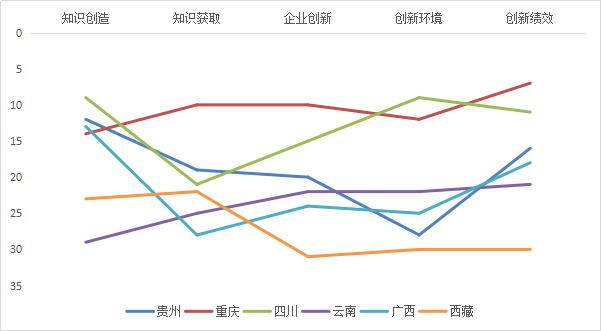 整体来看,根据2019年西南六省(市)5个一级指标排名,贵州2个一级指标处于第二位次,2个一级指标处于第三位次,1个一级指标处于倒数第二位次,仅高于西藏;从5个一级指标所处的位次来看,西藏5个一级指标均排在贵州省后面;云南有知识创造、知识获取、企业创新和创新绩效4个一级指标均排在贵州省后面,但是创新环境指标却领先贵州2个位次;广西有知识创造、知识获取、企业创新和创新绩效4个一级指标均排在贵州省后面,但是创新环境却领先贵州1个位次(见图5)。